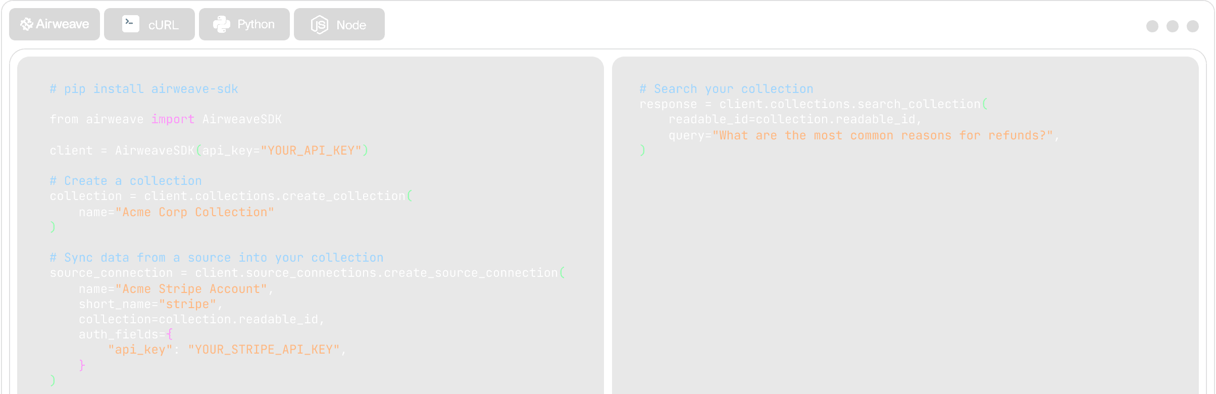 Drop Airweave into LangChain, Composio, Pipedream, or your custom agent stack. Five minutes from install to first answer.